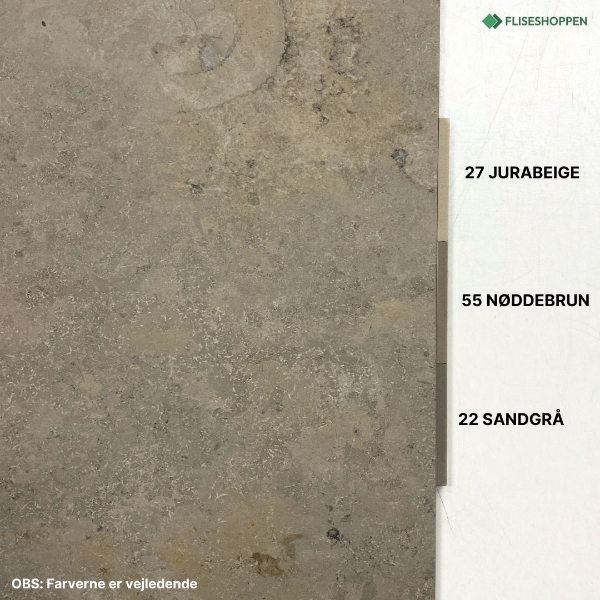 Til flisen Jura Beige Mat vil vi foreslå PCI Nanofug Premium i fugefarverne 27 Jurabeige, 55 Nøddebrun eller 22 Sandgrå.