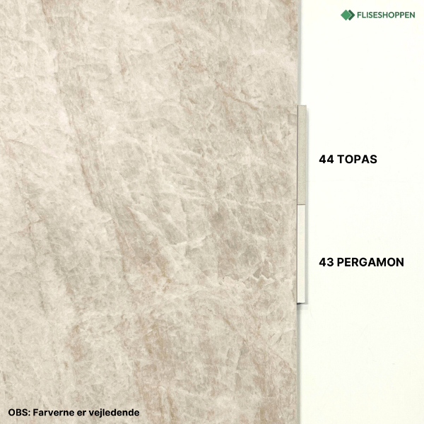 Til flisen Taj Mahal Mat vil vi foreslå silikone- og cementfuge fra PCI i fugefarverne 44 Topas eller 43 Pergamon.