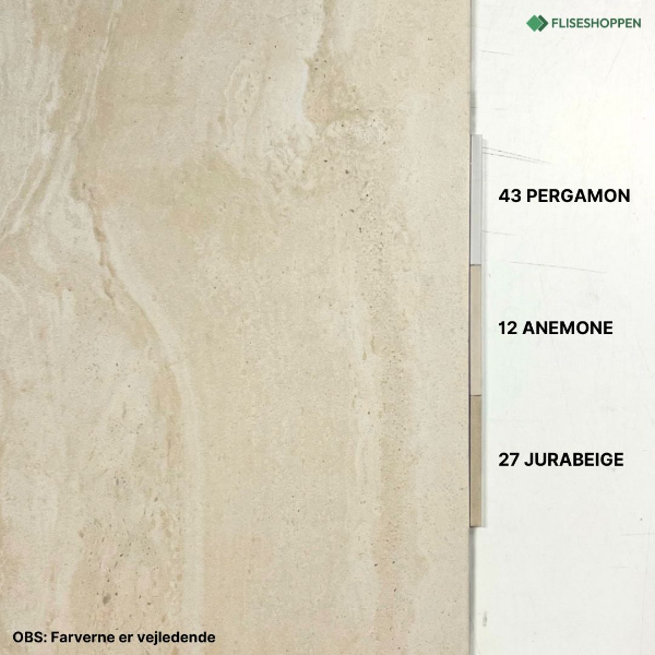 Til flisen Travertino RV Avorio vil vi foreslå PCI Nanofug Premium i fugefarverne 43 Pergamon, 12 Anemone eller 27 Jurabeige.